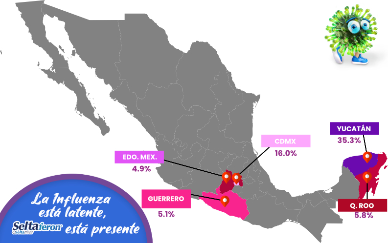 En la temporada de influenza estacional 2025-2026 las principales entidades de residencia con mayor confirmación de casos son Yucatán (35.3 %), Ciudad de México (16 %), Quintana Roo (5.8%), Guerrero (5.1 %) y Estado de México (4.9 %)