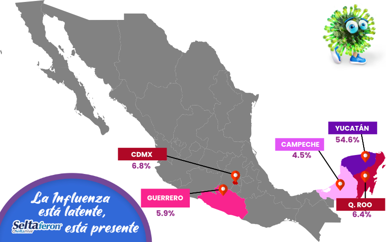 En la temporada de influenza estacional 2025-2026 las principales entidades de residencia con mayor confirmación de casos son Yucatán (54.6 %), Ciudad de México (6.8 %), Quintana Roo (6.4%), Guerrero (5.9 %) y Campeche (4.5 %).